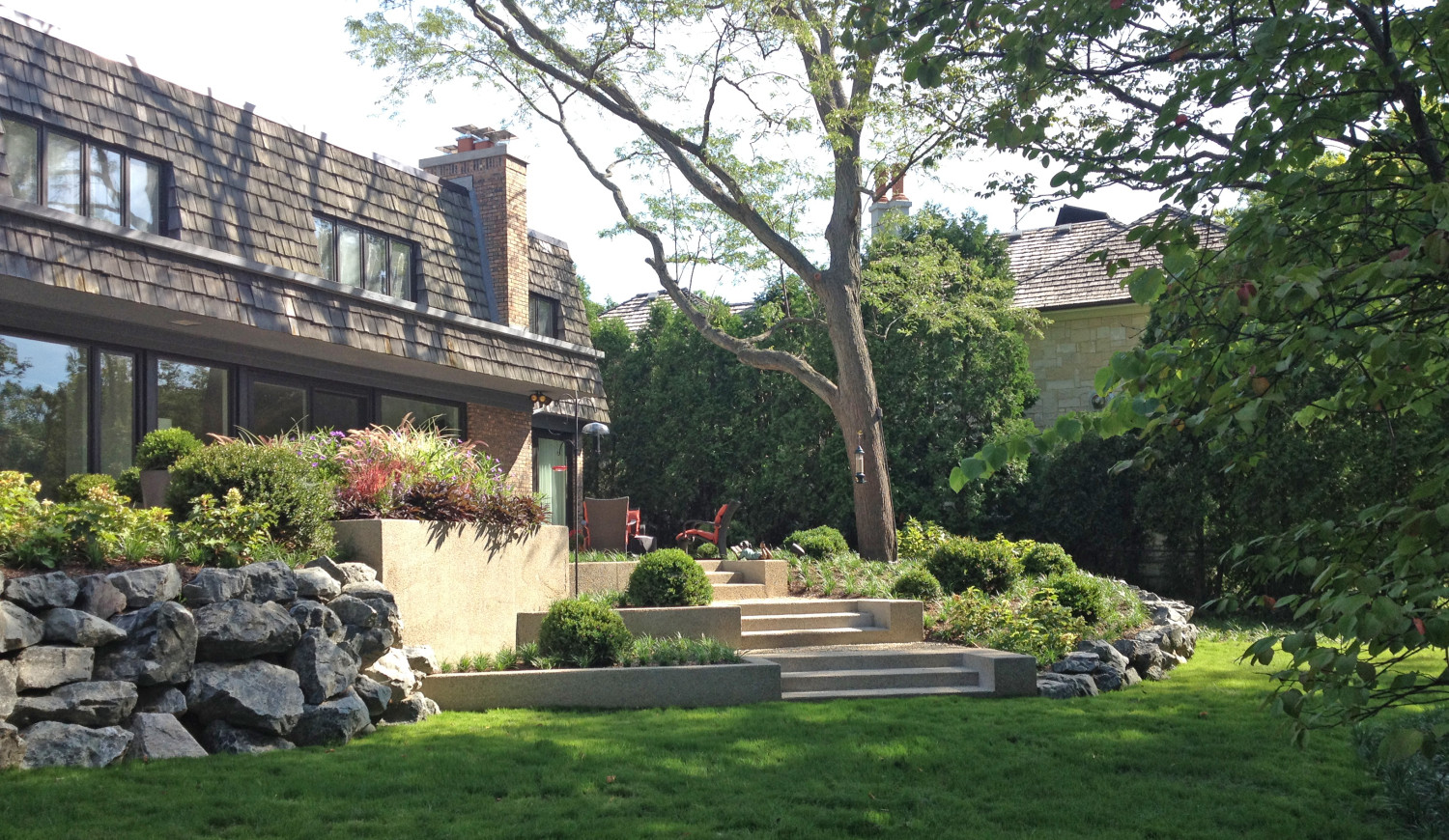 Glencoe Ravine Retreat – Exposed aggregate planter, seat walls, and steps