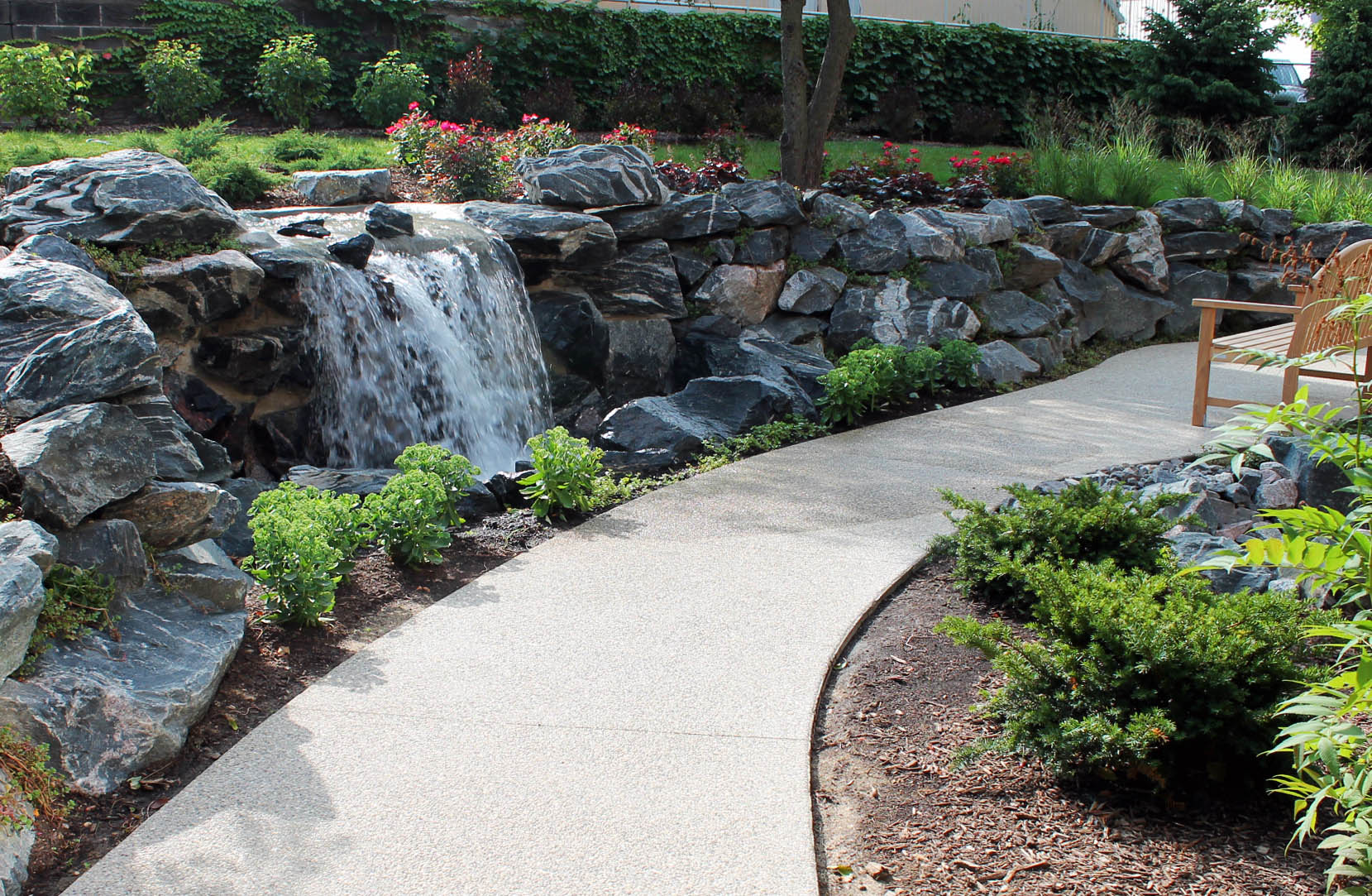 This beautiful project was installed at a senior living center in Barrington. The exposed aggregate pathway was designed to wind comfortably down what used to be a very steep slope. The walk was widened at multiple points to allow for benches so the residents could sit and enjoy the water features. The exposed aggregate concrete joints were saw-cut as to not intrude on the design.