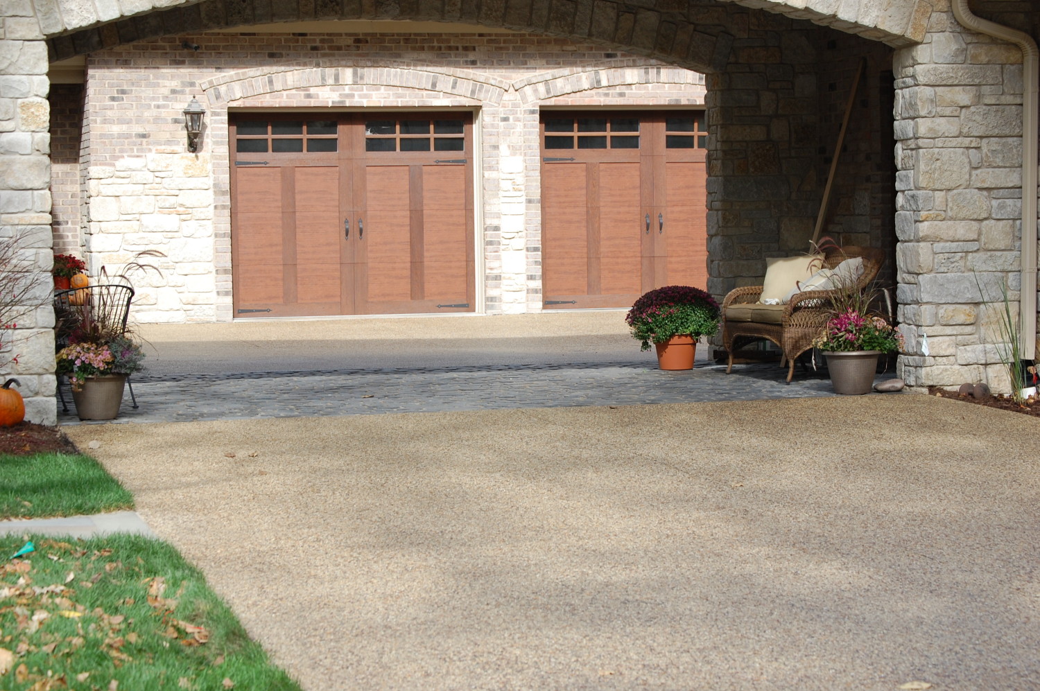 This exposed aggregate driveway was a perfect match to the house stone. We seeded red flint stone in with the base color exposed aggregate to achieve the desired color. The parking court has radiant heat in the concrete so the homeowner never has to shovel snow. The driveway was sealed with an exposed aggregate specific sealer to add luster and protect from treed debris.